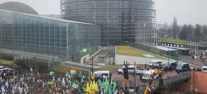 Lungo le strade di Strasburgo, le sigle e le bandiere che rappresentano gli agricoltori nei vari Paesi membri si sono unite, mischiate in un caleidoscopio di colori di giubbotti e bandiere, a testimoniare un malessere transnazionale.