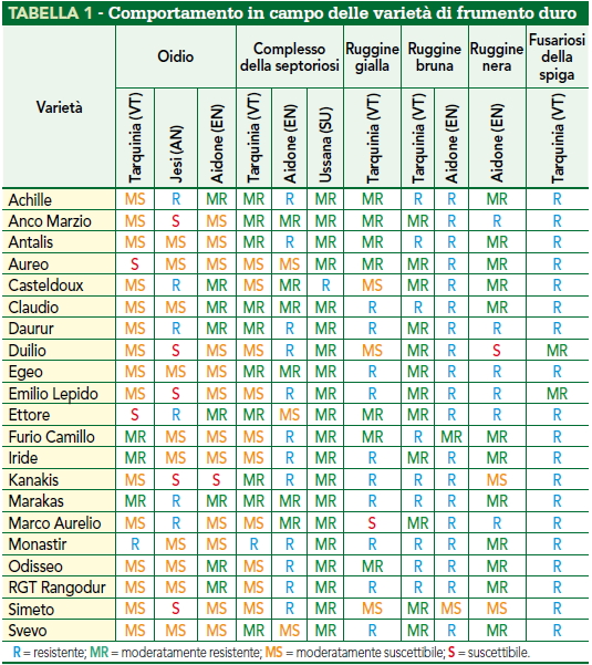 Per quanto riguarda l’oidio le infezioni più elevate sono state rilevate nei campi di Tarquinia (Viterbo), Jesi (Ancona) e Aidone (Enna) e tutte le varietà saggiate sono risultate suscettibili o moderatamente suscettibili in almeno una delle tre località, a eccezione della cultivar Marakas che ha mostrato il miglior comportamento in campo (tabella 1).