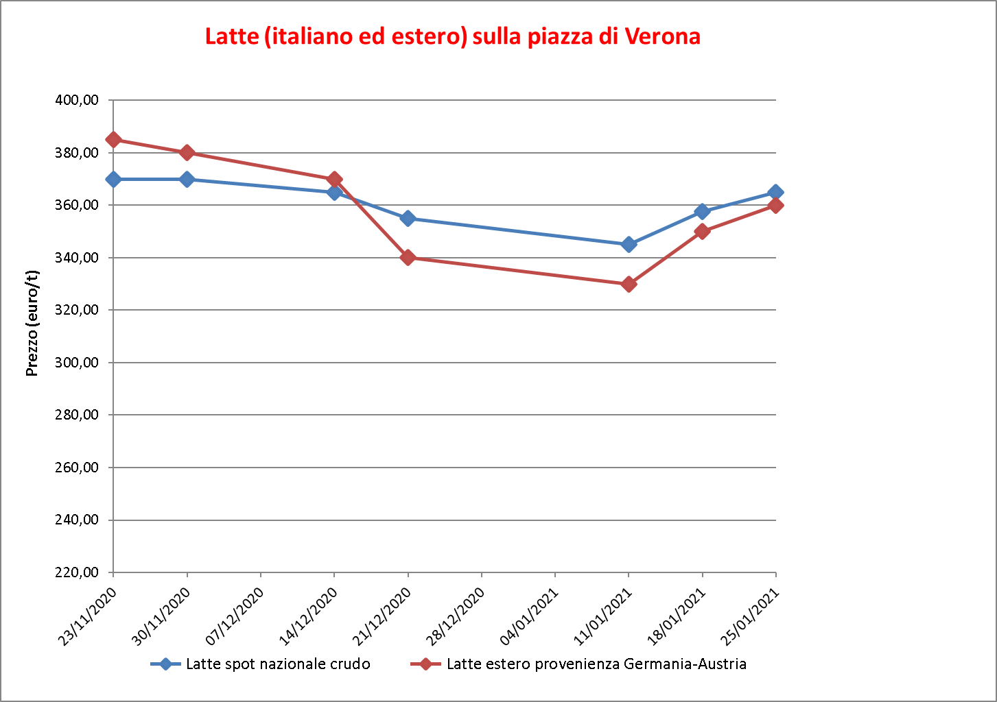 Nel caso della piazza di Verona, il prezzo del latte nazionale crudo è stato fissato a 365,00 euro/t, per un aumento del +2,1% rispetto alla settimana precedente, mentre il latte estero di provenienza Germania-Austria è salito a 360,00 (+2,9%). Negativo, anche in questo caso, il confronto tendenziale.