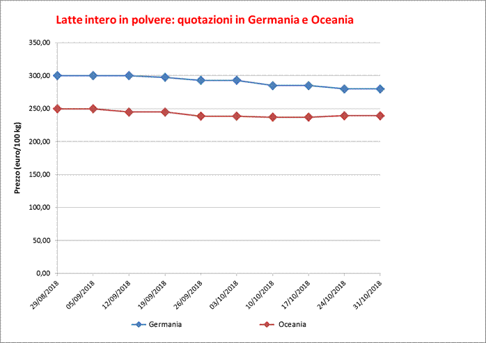 Nella settimana dal 29 ottobre 4 novembre in Germania il prezzo dell’SMP (latte scremato in polvere) è rimasto stabile a 130,50 euro/100 kg per il prodotto ad uso zootecnico, mentre il prodotto dell’Oceania ha registrato una flessione rispetto alla precedente rilevazione (-0,9%), venendo ora scambiato a 174,51 euro/100 kg.