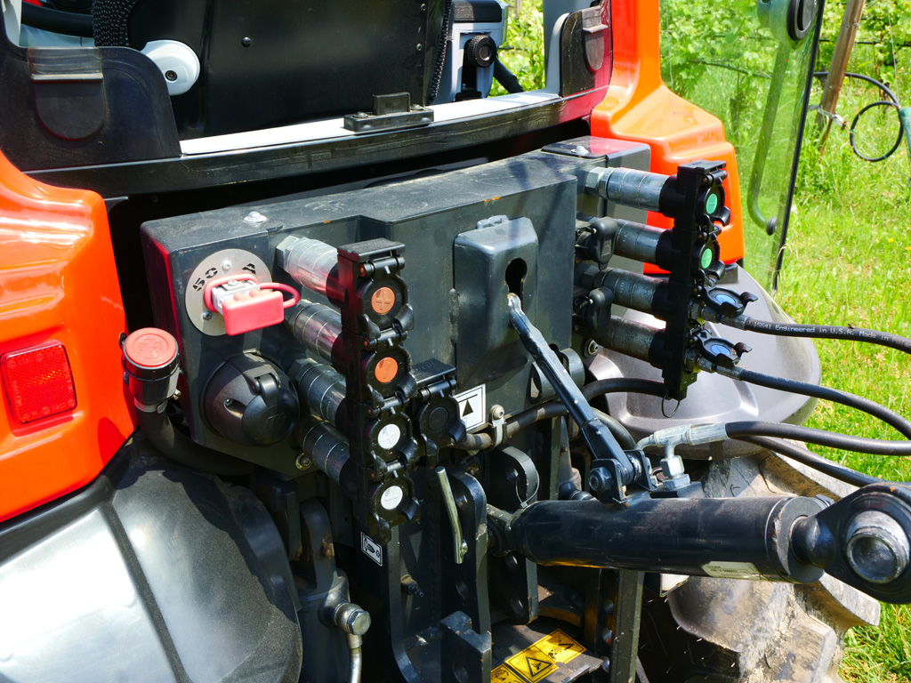 L’impianto idraulico è composto da tre circuiti indipendenti: uno per il cambio e due per i servizi, ciascuno con la propria pompa dedicata. I distributori, fino a un massimo di 9 a doppio effetto (per un totale di 26 innesti grazie ai deviatori di flusso e ritorni liberi), possono contare su un serbatoio da 35 L di olio e una pompa a portata variabile da 90 L/min con pressione massima di esercizio di 200 bar.