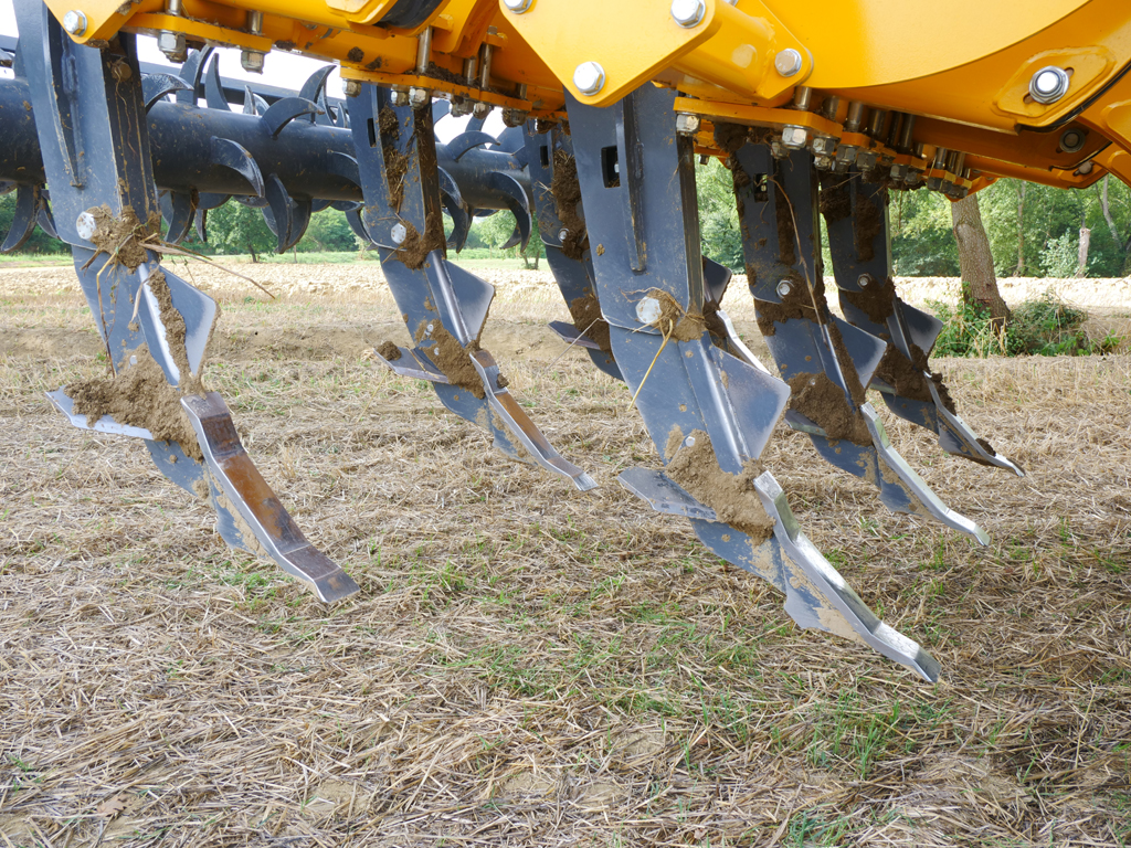 Le 7 ancore, suddivise in due ranghi (3 anteriori e 4 posteriori), presentano un interasse di 850 mm e 435 mm di spaziatura tra le ancore. La luce libera è di 850 mm per lavorare fino a 600 mm di profondità. Indicativamente quindi, il rapporto profondità max (600 mm)/distanza ancore (435 mm) è di 1,38, ovvero una più uniforme capacità di frantumazione e rimescolamento.