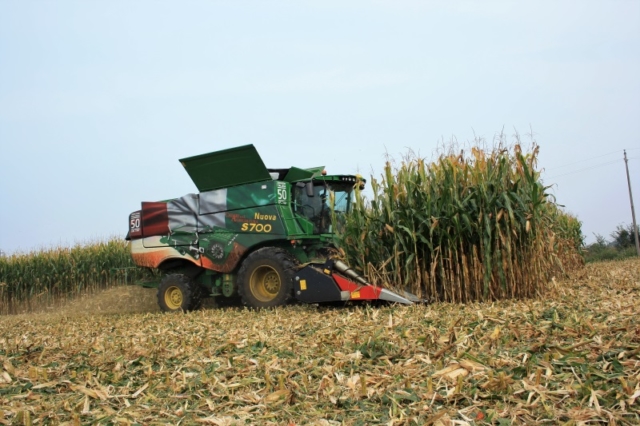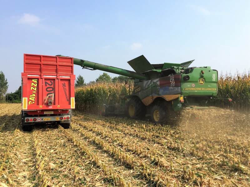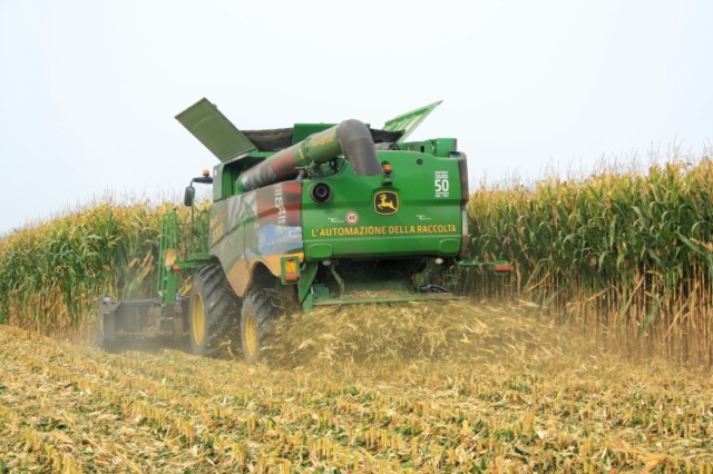 Su mais e su riso con la mietitrebbia assiale monorotore John Deere S770i da 455 CV di potenza massima.