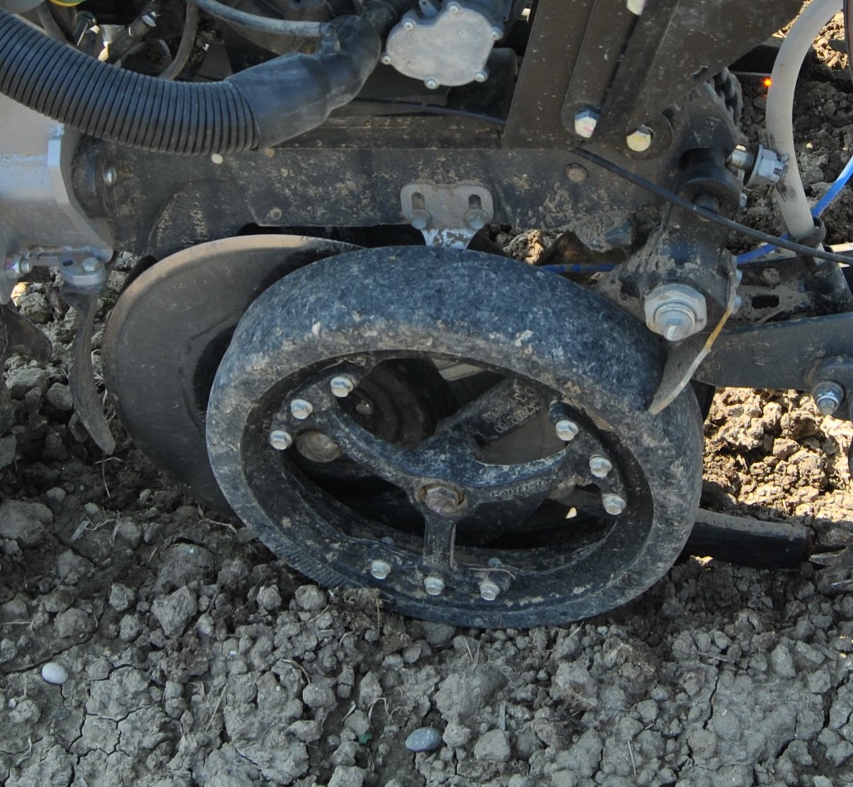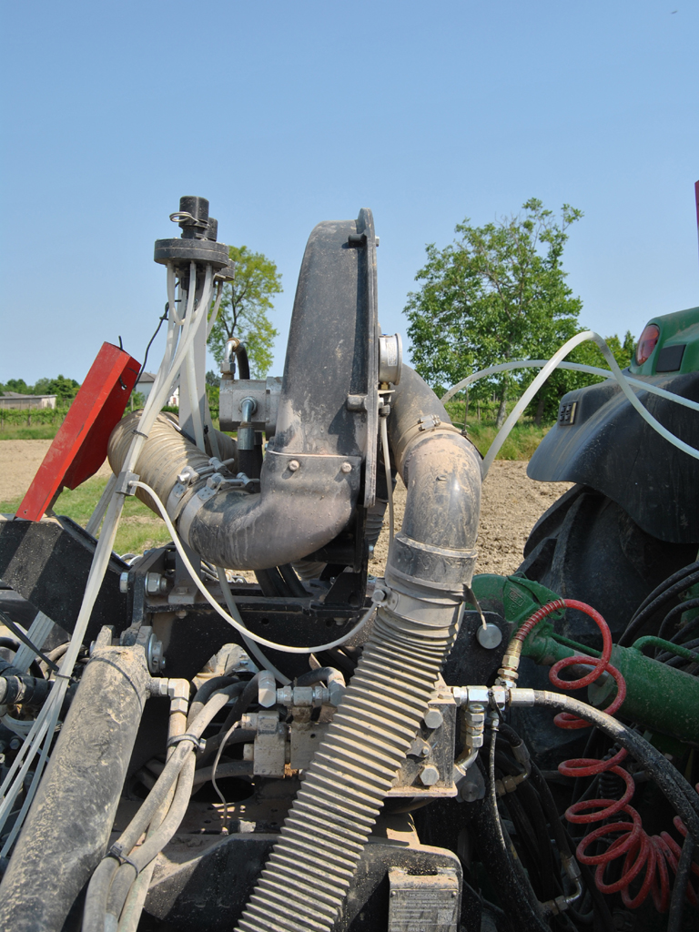 In posizione centrale sono inseriti la turbina e il ripartitore del concime liquido proveniente dal serbatoio (600 L) accoppiato ai bracci di sollevamento anteriori della trattrice. L’elemento di semina è collegato al telaio attraverso un sistema a parallelogramma è costituito anteriormente da una coppia di ruotini stellati a regolazione idraulica, seguiti dall’assolcatore a doppio disco, per poi terminare con l’elemento premi-seme e il sistema di chiusura del solco. Nella parte superiore all’elemento di semina sono collocati la tramoggia del seme (62 L) con relativo distributore a controllo elettronico e quella per il contenimento dei prodotti microgranulari (25 L) posizionata posteriormente ed anch’esso munito di distributore volumetrico a gestione elettrica.
