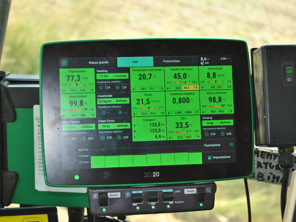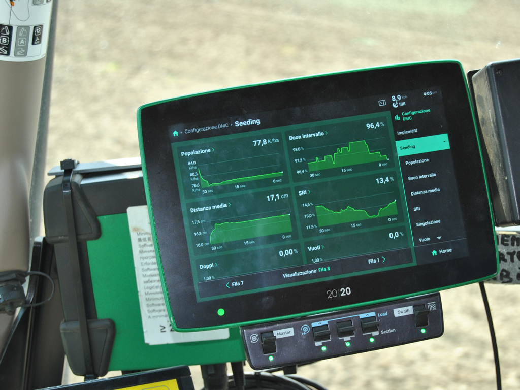 Il collegamento Isobus e la tecnologia Precision Planting integrata all’operatrice permettono di impostare e monitorare dal display in cabina i parametri operativi relativi alla semina in atto, con il dettaglio della precisione di deposizione sulle singole file, la forza esercitata dagli assolcatori o dai ruotini chiudi-solco fino alle condizioni del solco in corrispondenza del punto di deposizione del seme quali umidità, temperatura, Carbonio organico, conducibilità elettrica, uniformità del solco e presenza di residuo.