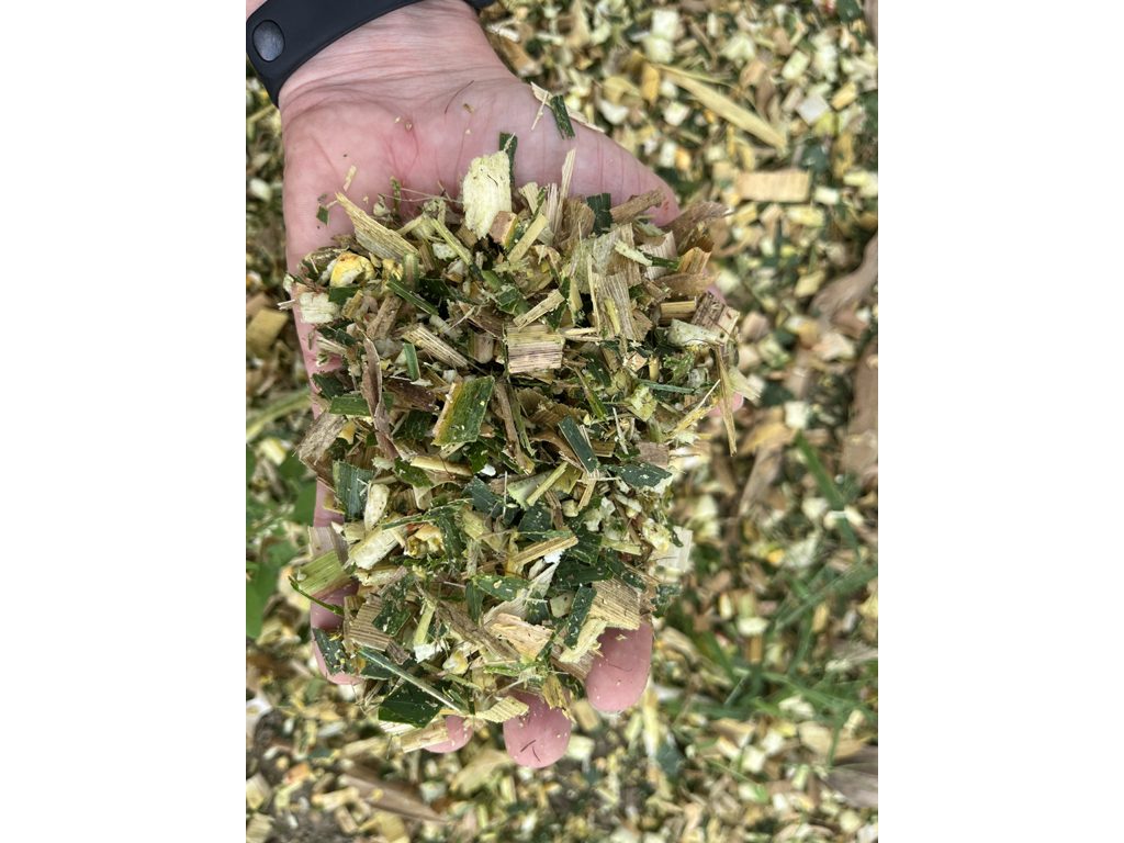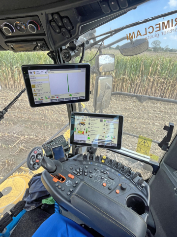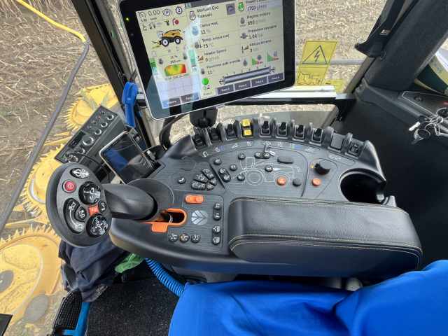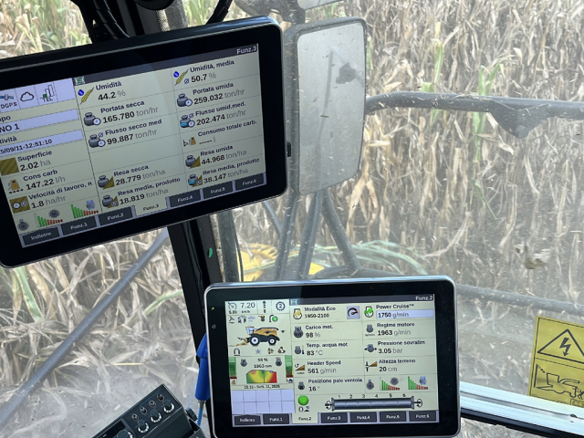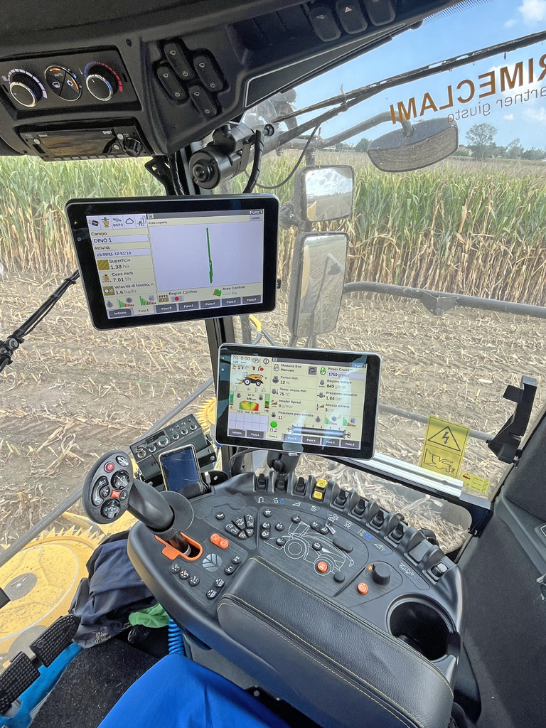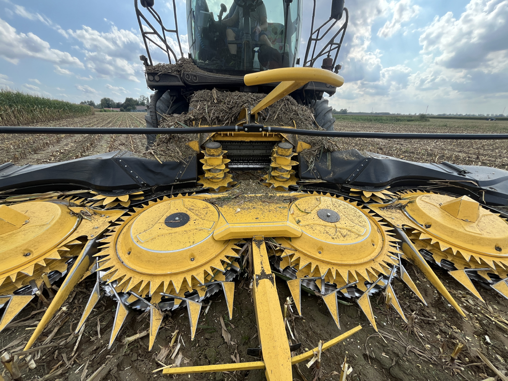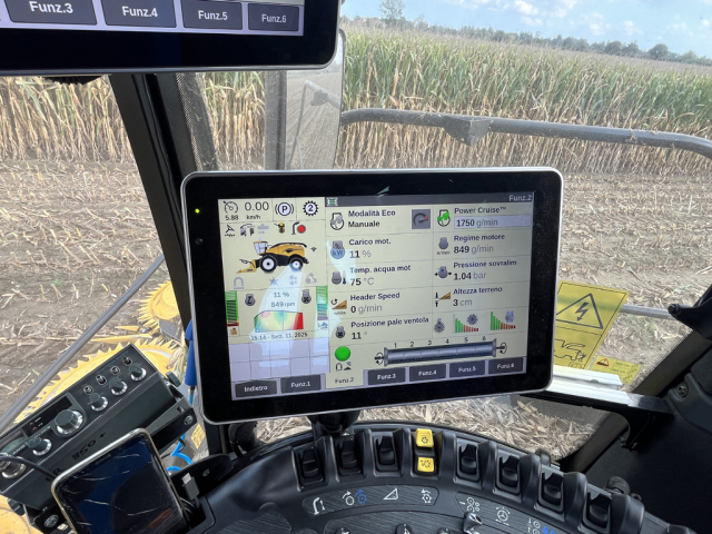 Alla trincia era applicata una testata di raccolta da 12 file (6 tamburi con dischi ad alta capacità da 1.350 mm di diametro) modello 900BFI Pro con sistema di guida automatica.