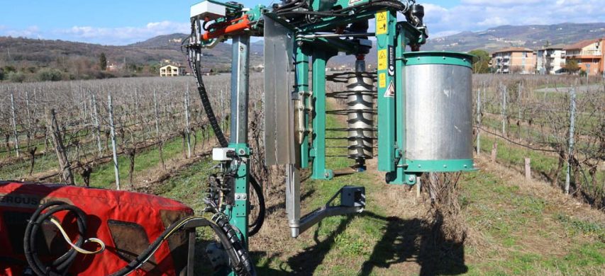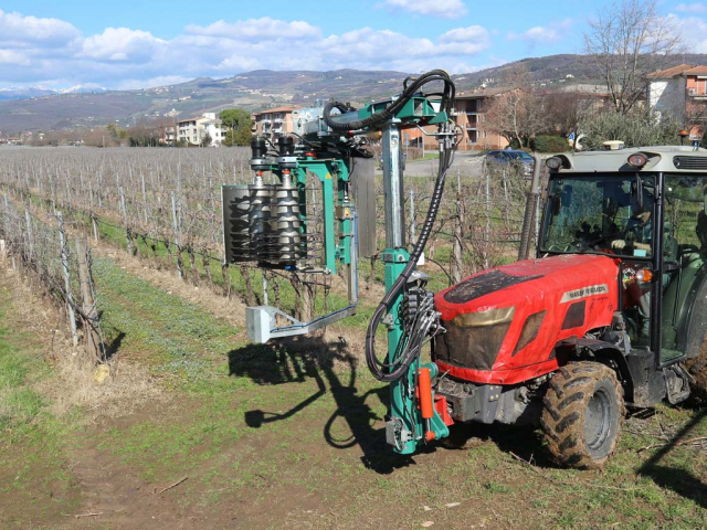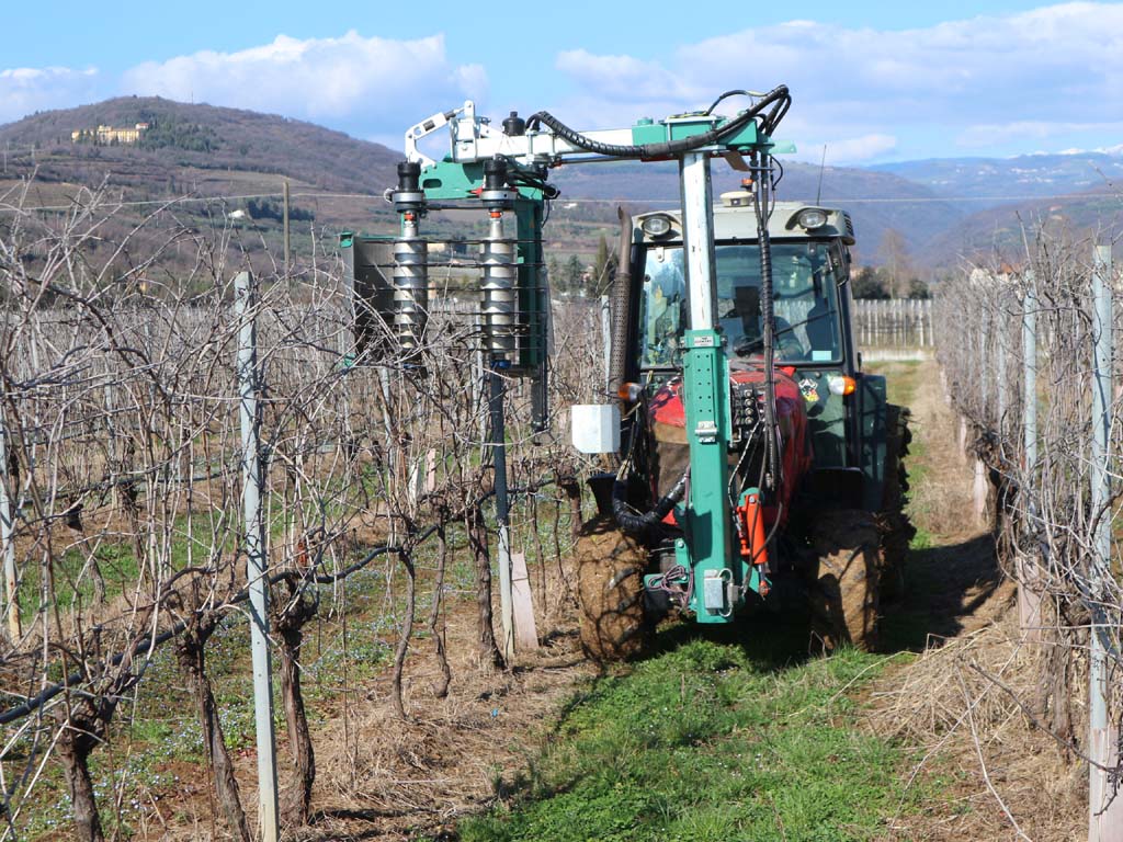 Nell’areale del Valpolicella, su vigneti allevati a Guyot, abbiamo provato la prepotatrice del costruttore tedesco Clemens nella versione più piccola “S” con gabbia da 468 mm di lunghezza, applicata alla colonna porta-attrezzi Atlas flangiata anteriormente al trattore. L’operatrice era allestita con sistema di controllo automatico di apertura e chiusura dei rulli prepotatori grazie all’interazione tra un sensore ottico di rilevamento dei pali e di velocità di avanzamento del cantiere.
