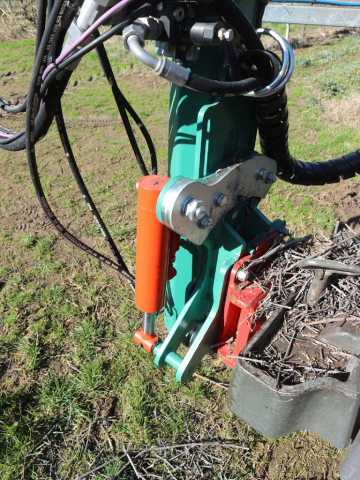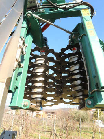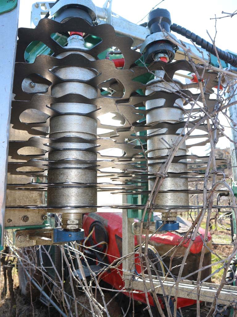 La testata di taglio è rappresentata da due rotori contro-rotanti, mossi da motori idraulici dedicati. Sui rotori sono inseriti i dischi di taglio (7 per rullo nell’esemplare visionato) che grazie al particolare profilo dei denti e la loro sovrapposizione richiamano i tralci di vite verso il centro provocandone il taglio. La versione da noi visionata era la più piccola con gabbia da 468 mm di altezza di taglio (S) mentre la maggiore (M) presenta un fronte di lavoro di 728 mm.