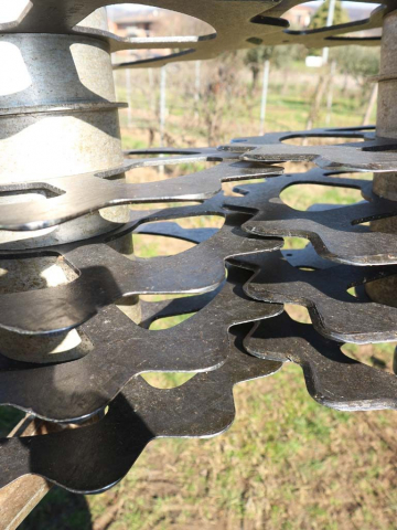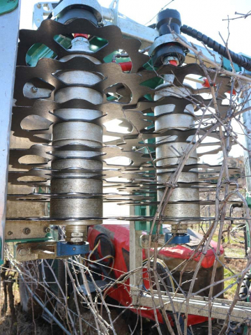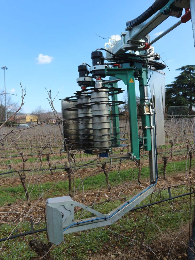 Il costruttore tedesco Clemens con sede a Wittlich nei pressi del fiume Mosella, specializzato dal 1952 nella realizzazione di attrezzature per la gestione del terreno e la parete vegetativa del vigneto-frutteto (nel n. 5/2025 a pag. 7 del mensile MAD – Macchine Agricole Domani è stato pubblicato un reportage sulla visita allo stabilimento Clemens), propone una soluzione a dischi per la potatura e la prepotatura installata su di una struttura portante a colonna.