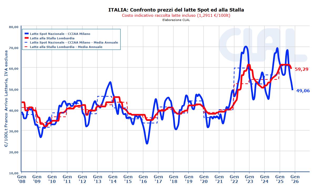 Continua a calare il prezzo del latte spot in Italia. Il 17 novembre scorso il prezzo del latte crudo spot in cisterna franco arrivo latteria, in base alle elaborazioni Clal dei dati delle Camere di Commercio di Milano, Monza, Brianza e Lodi, oscillava tra 46,40 e 47,94 euro/100 L di latte Iva esclusa.